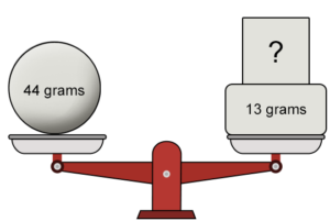 Since the scale is balanced, weight on both sides = 44 grams