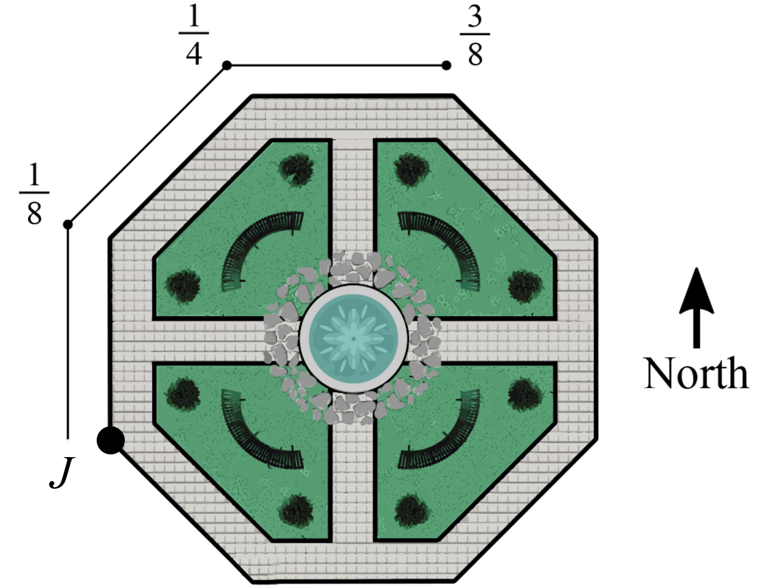 If she walks 31 of the distance around the garden, in what direction is she heading?